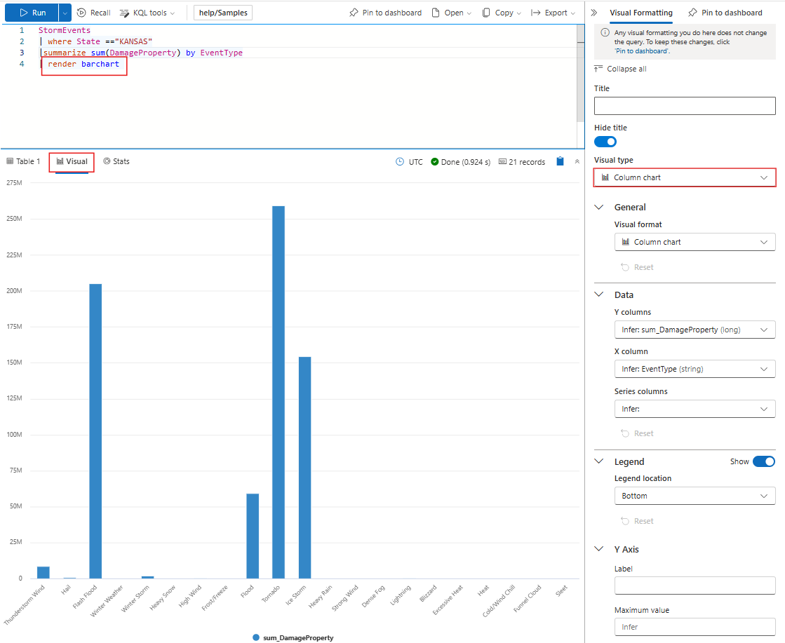 StormEvents | where State == 'KANSAS' | summarize sum(DamageProperty) by EventTypeIn the results grid, select + Add visual.