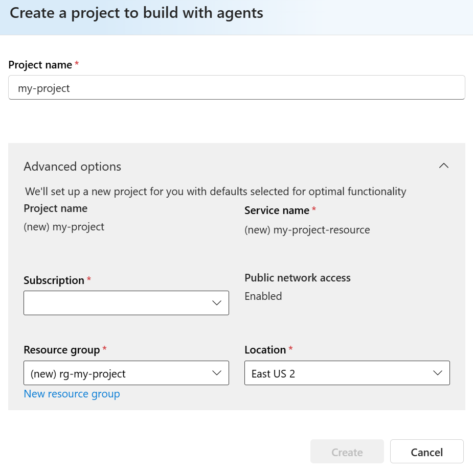 Enter a name for the project. If you want to customize the default values, select Advanced options.