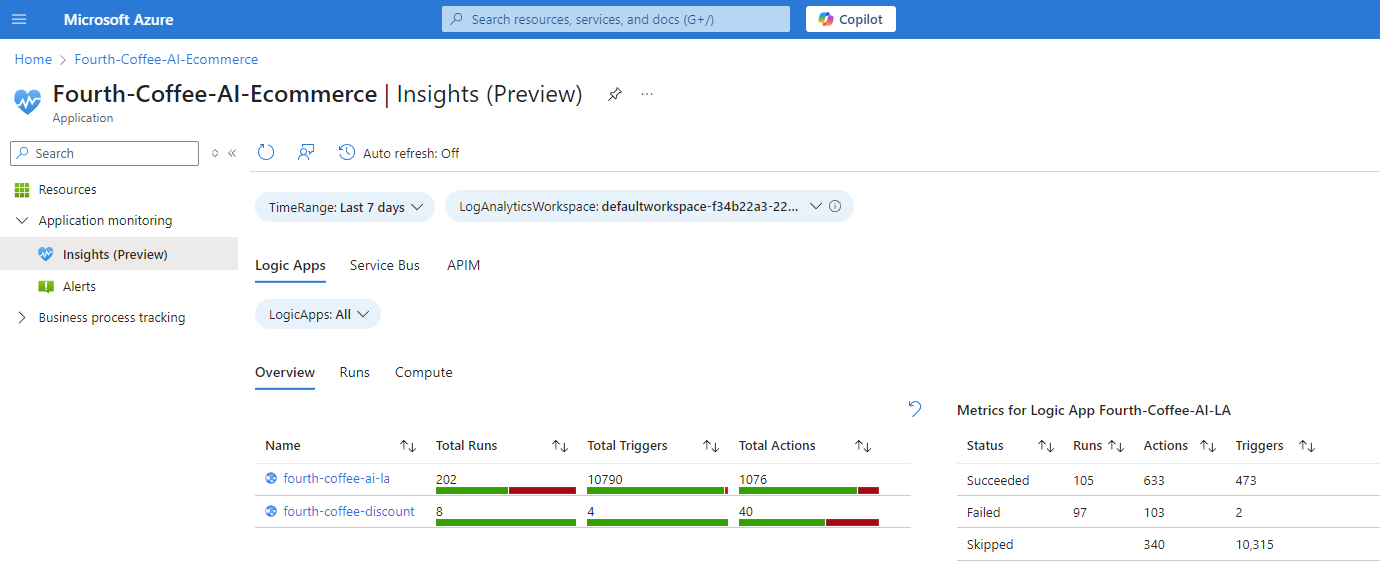 For the selected duration, the Insights page shows the resources in your application based on the Azure service category, such as Logic Apps, Service Bus, and APIM.