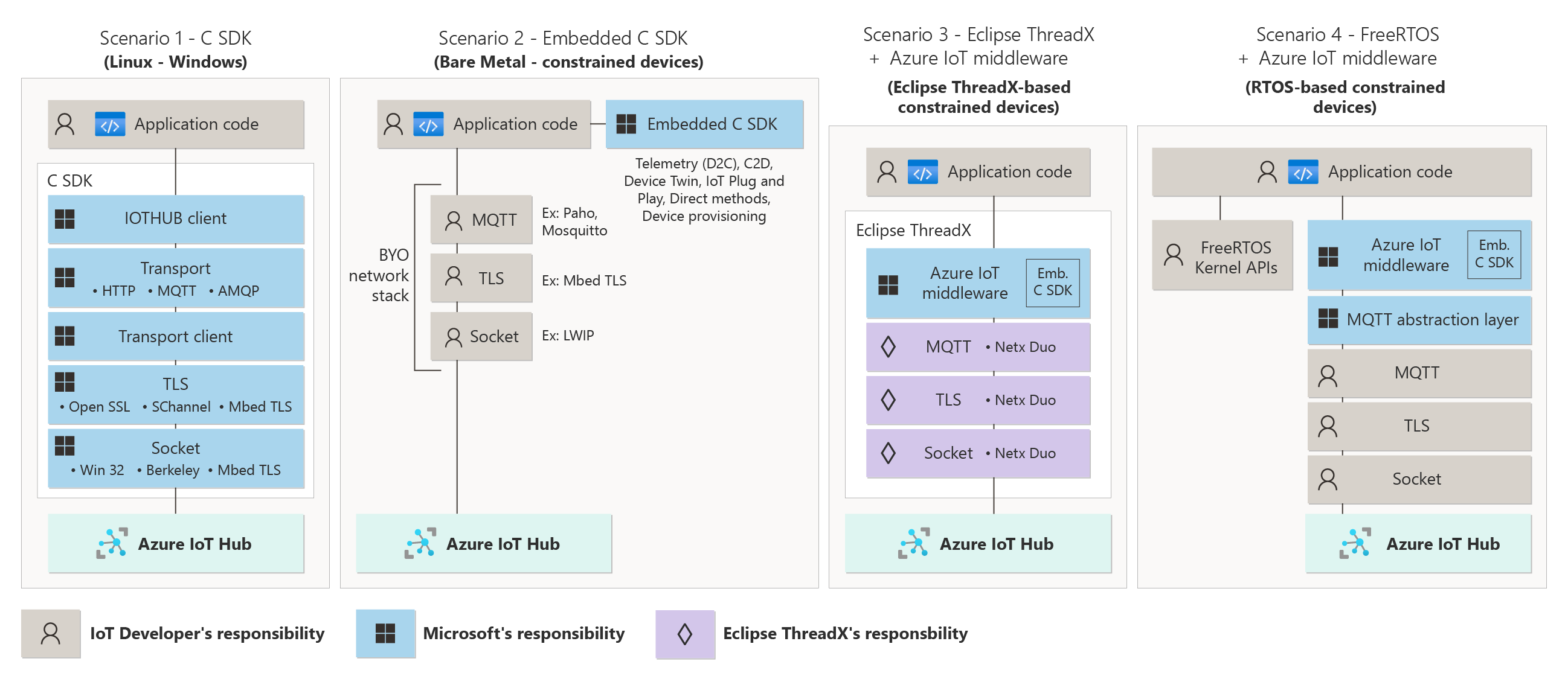The following diagram shows four common scenarios in which customers connect devices to Azure IoT, using a C-based (C99) SDK. The rest of this article provides more details on each scenario.