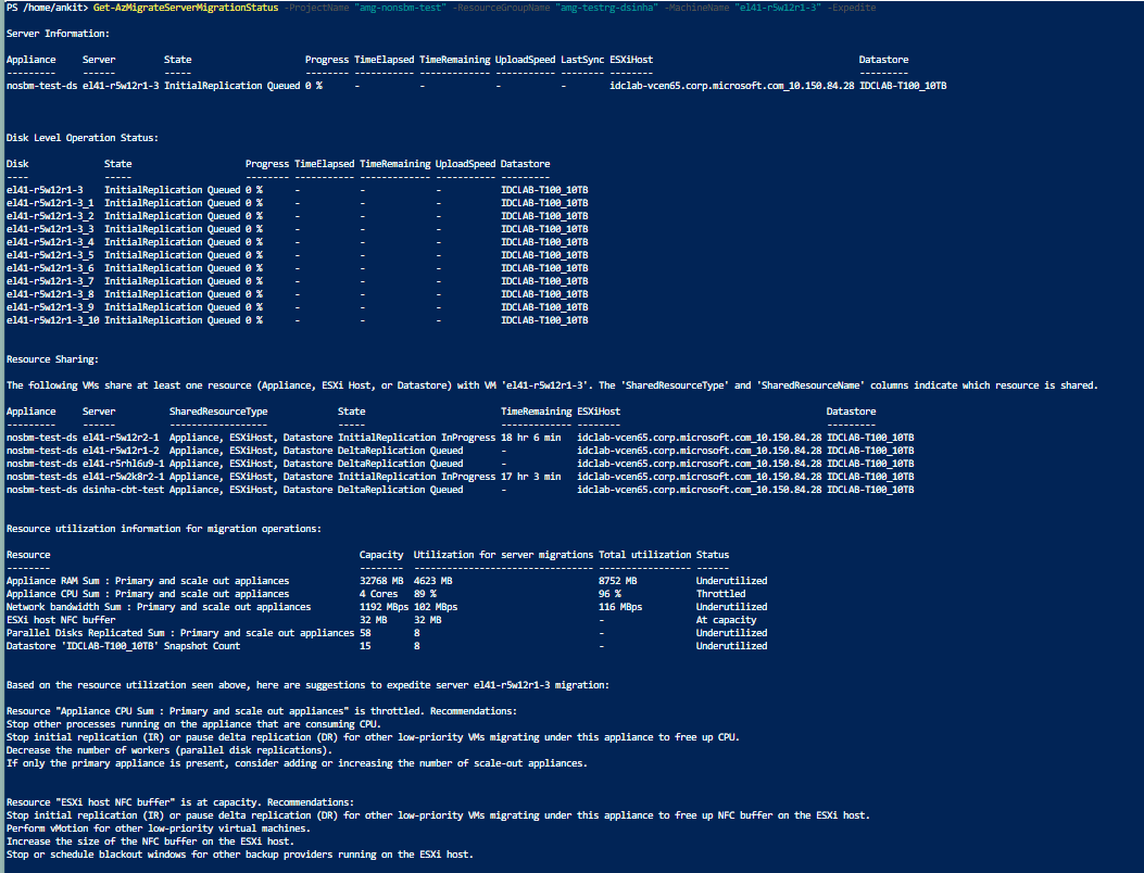 Expediteflag. This retrieves appliance operating parameters and a prioritized list of recommended actions to help reduce the remaining migration time for the specified server.Get-AzMigrateServerMigrationStatus -ProjectName "<your-project-name>" -ResourceGroupName "<your-resource-group>" -MachineName "<your-server-name>" -ExpediteYou get the following output: