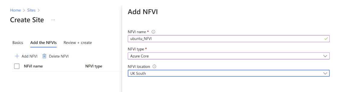 Navigate to the Add NFVI tab of the Create site screen and select + Add NFVI.