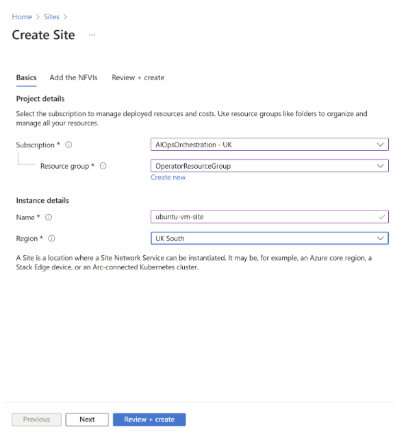 Setting Value Subscription Select the Subscription. Resource Group Select OperatorResourceGroup. Name Enter ubuntu-vm-site. This name should be unique in your subscription to avoid confusion when you create the SNS later. Region Select the location you used for your prerequisite resource.