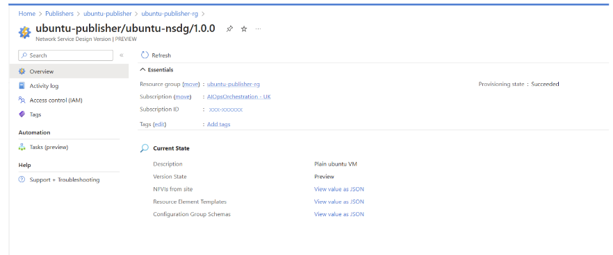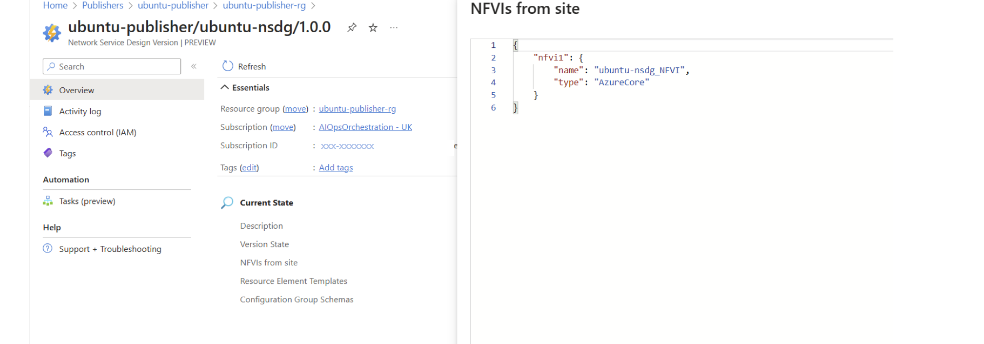 Prior to creating a site, navigate to the resource group you created in the Quickstart: Design a Network Service Design (NSD) for Ubuntu Virtual Machine (VM) as a Virtualized Network Function (VNF) and select Network Service Design Version.