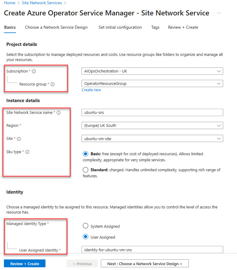 Setting Value Subscription Select your subscription. Resource group Select operatorresourcegroup. Name Enter ubuntu-sns. Region Select the location you used for your prerequisite resources. Site Enter ubuntu-vm-site. Managed Identity Type User Assigned. User Assigned Identity Select identity-for-ubuntu-vm-sns.
