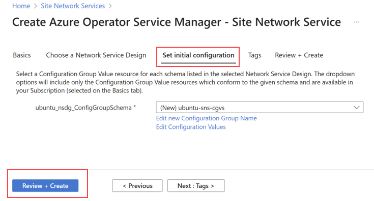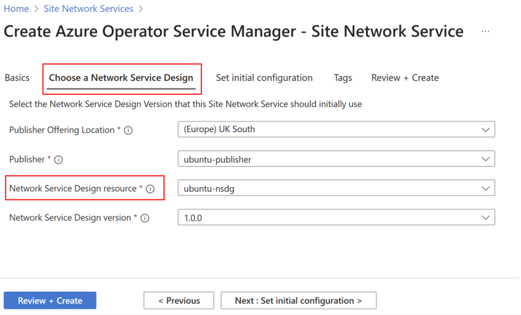 Setting Value Publisher Offering Location Select UK South Publisher Select ubuntu-publisher Network Service Design resource Select ubuntu-nsdg Network Service Design version Select 1.0.0 Select Next.