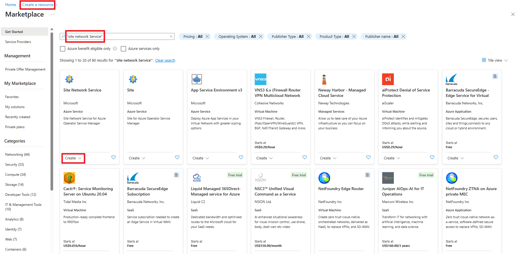 In Azure portal, enter "Site Network Services" into the search and select Site Network Service from the results.