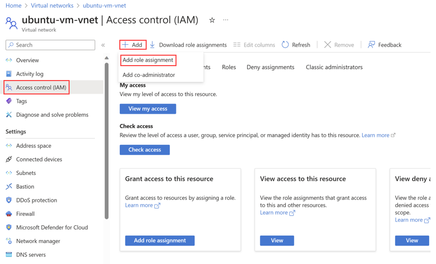 In the side menu of the Virtual Network, select Access Control (IAM).