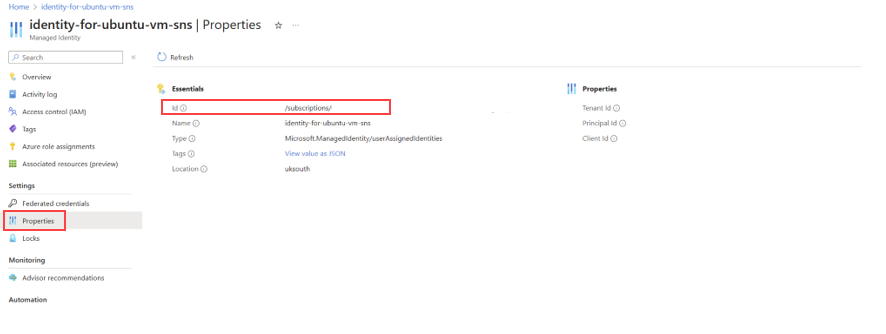 Locate ID: Select the properties section of the managed identity. You should see various information about the identity. Look for the ID field.