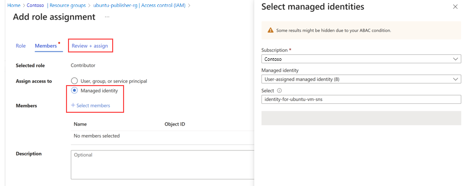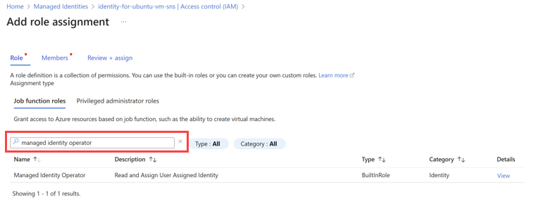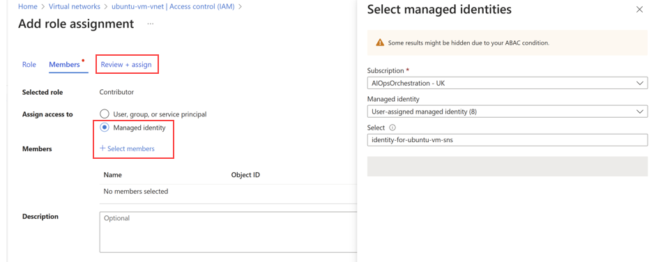 Select + Select members and navigate to the user-assigned managed identity called identity-for-ubuntu-vm-sns and proceed with the assignment.