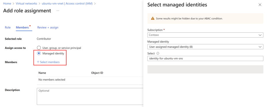 Choose + Select members then find and choose the user-assigned managed identity identity-for-ubuntu-vm-sns.