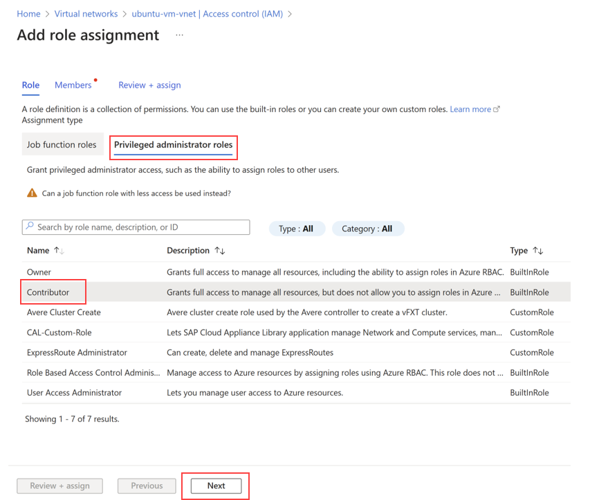 Under the Privileged administrator roles, category pick Contributor then proceed with Next.