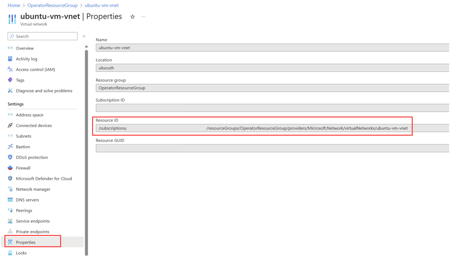 Locate ID: Select the properties section of the Virtual Network. You should see various information about the identity. Look for the Resource ID field.