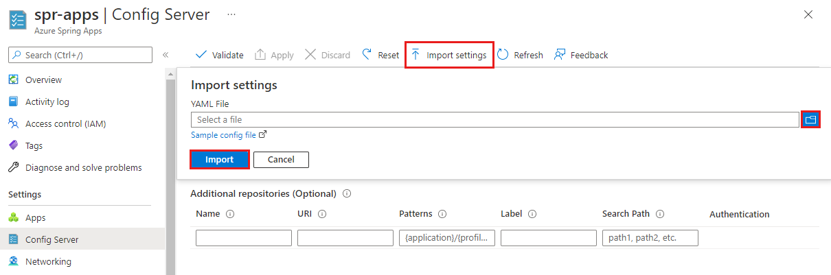 asyncoperation. Config Server should report success after 1-2 minutes. The information from your YAML file displays in the Azure portal.Select Apply to finish the import.