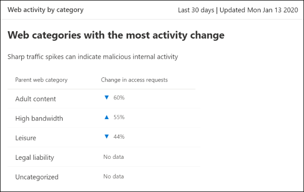 This card lists the parent web content categories with the largest increase or decrease in the number of access attempts. You can explore changes in web activity patterns in your organization from last 30 days, 3 months, or 6 months. Select a category name to view more information.