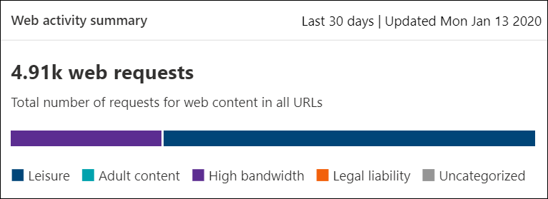 This card displays the distribution of blocked access attempts across the different parent web content categories. Select one of the colored bars to view more information about a specific parent web category.