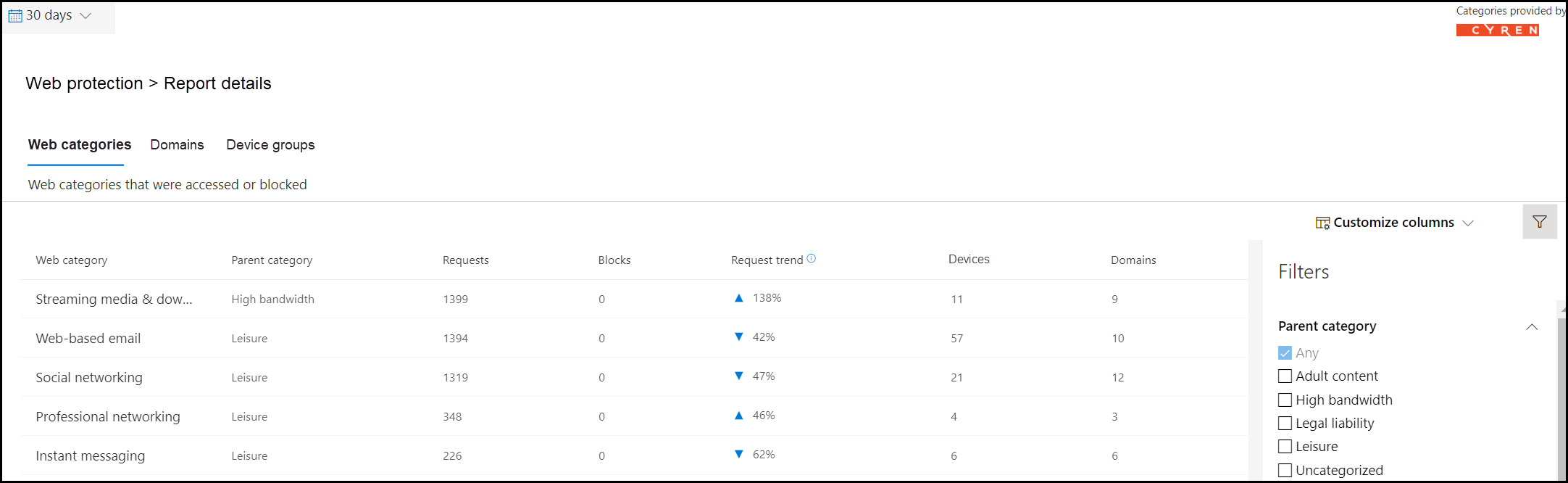 - Device groups: Lists all the device groups that have generated web activity in your organization