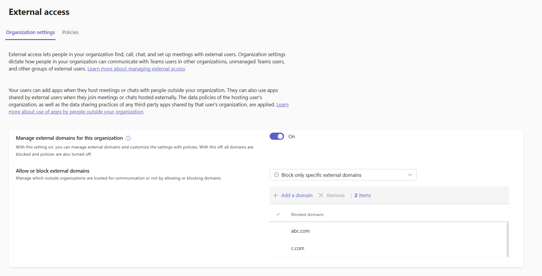 These entries also appear on the Organization settings tab of the External access page in the Microsoft Teams admin center at https://admin.teams.microsoft.com/company-wide-settings/external-communications: