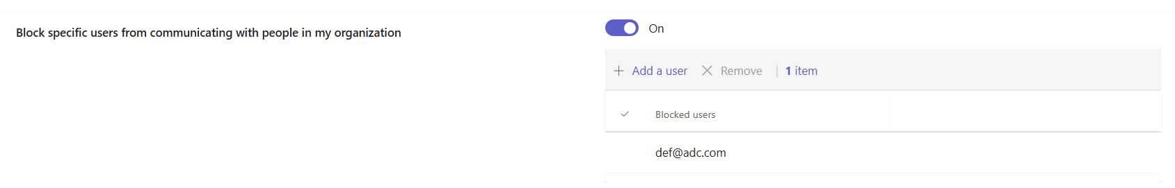 After you add the block entry for the domain or sender address in Teams, all new Teams communication from that organization is blocked. Block communication includes new Teams meetings, chats, channels, and calls. Existing Teams meetings, chats, channels, and calls are deleted.