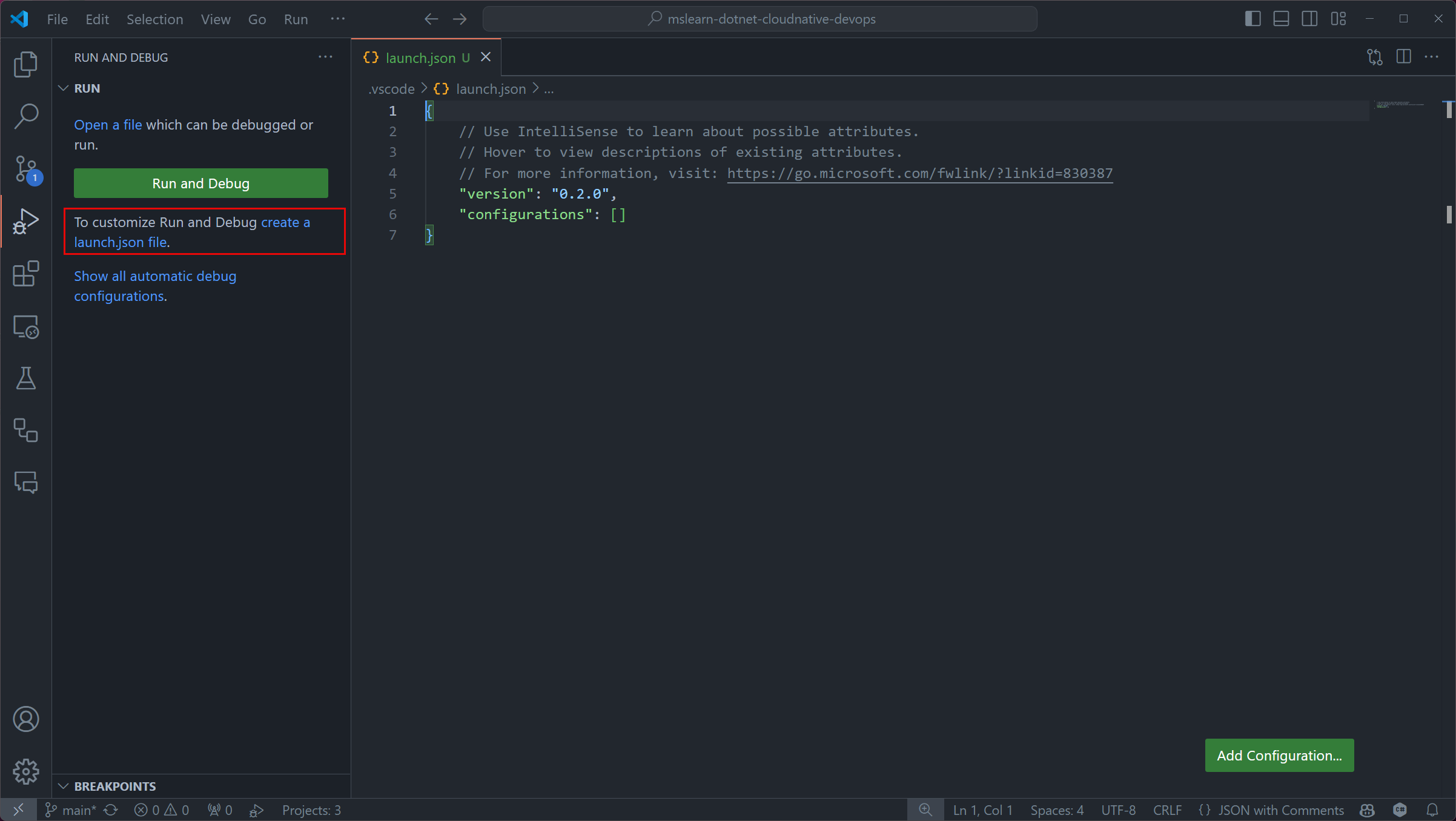 Select the create a launch.json file link.