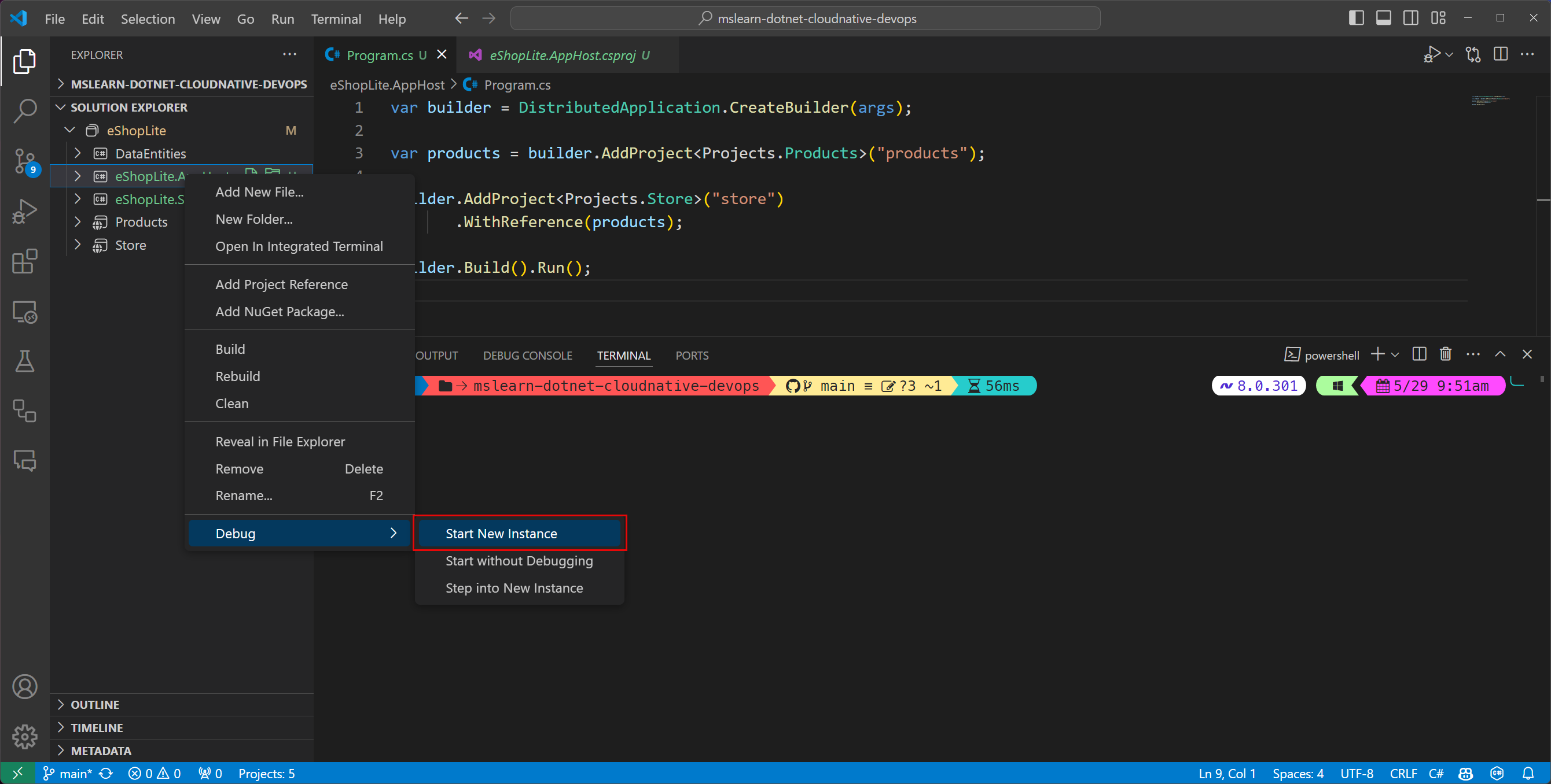 Start the AppHost project by running the following command: