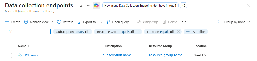 เมื่อคุณทําตามขั้นตอนต่อไปนี้เสร็จแล้ว ให้สร้างทรัพยากร Data Collection Endpoint (DCE) และ Data Collection Rule (DCR) ในภูมิภาคเดียวกับพื้นที่ทํางาน Log Analytics