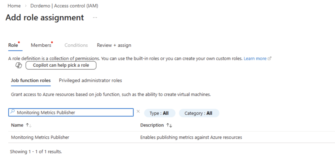 ให้บทบาท Monitoring Metrics Publisher แก่แอปในทรัพยากร DCR ของแต่ละตาราง สําหรับขั้นตอนการกําหนดบทบาท โปรดดู กําหนดบทบาท Azure โดยใช้พอร์ทัล Azure