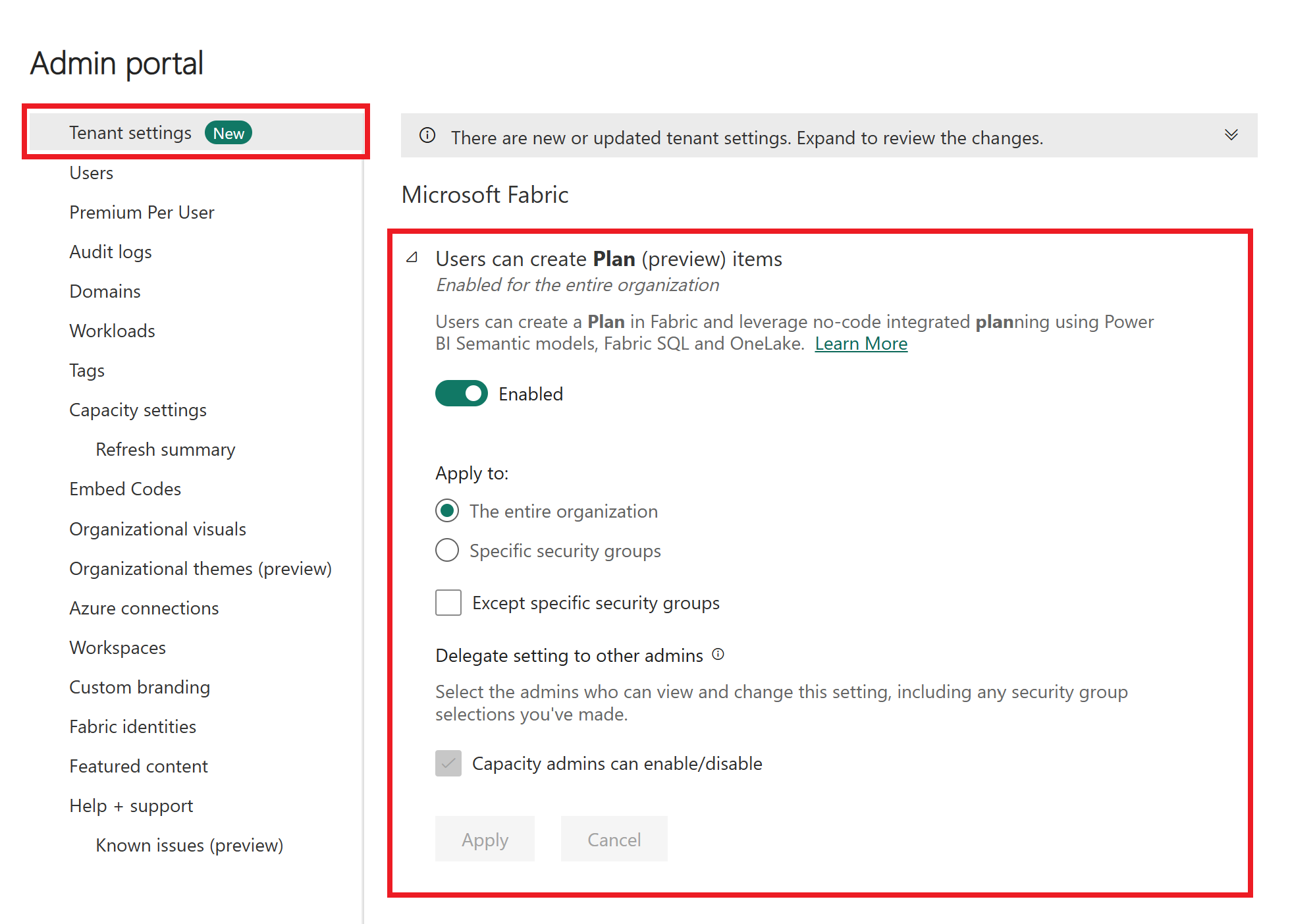 แผน (พรีวิว) เป็นการจัดการประสิทธิภาพขององค์กรและองค์กร (EPM & CPM) ที่สร้างขึ้นใน Microsoft Fabric โดยตรง ช่วยให้องค์กรสามารถสร้าง จัดการ และวิเคราะห์แผน เช่น งบประมาณ การคาดการณ์ และสถานการณ์ภายในแพลตฟอร์มที่มีการควบคุมเดียวกันกับที่ใช้สําหรับข้อมูล การวิเคราะห์ และ AI