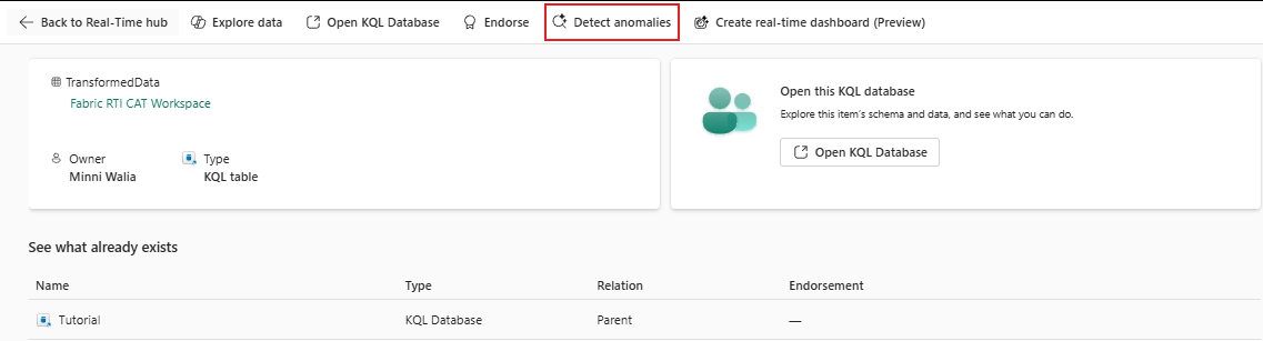 ภายใต้ สตรีมข้อมูลทั้งหมด ให้เลือกตาราง Eventhouse TransformedData ที่คุณสร้างขึ้นในบทช่วยสอนก่อนหน้านี้ หน้ารายละเอียดตารางจะเปิดขึ้น เลือก ตรวจหาความผิดปกติ จากเมนูด้านบน