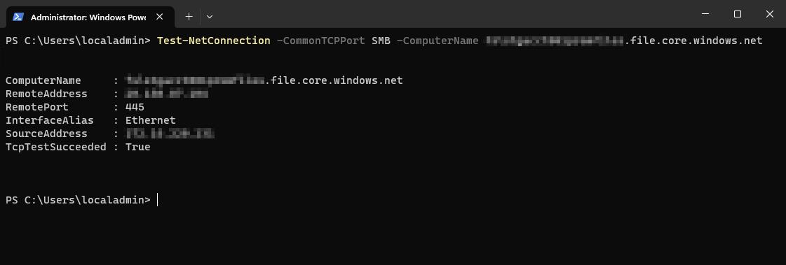 Test-NetConnection -ComputerName <server-fully-qualified-domain-name> -CommonTCPPort SMB