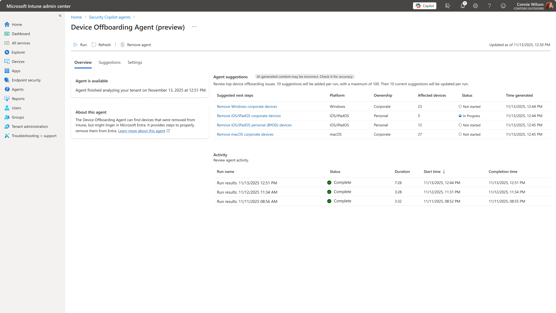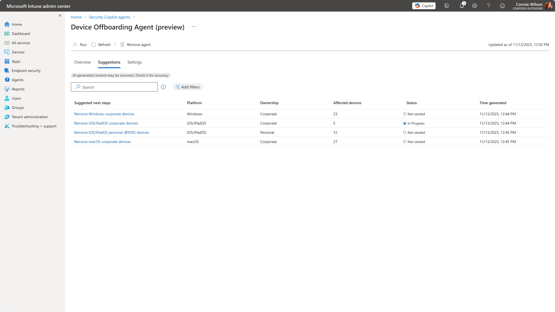 - Agent suggestions, which are the list of devices to offboard that are not started or in progress.