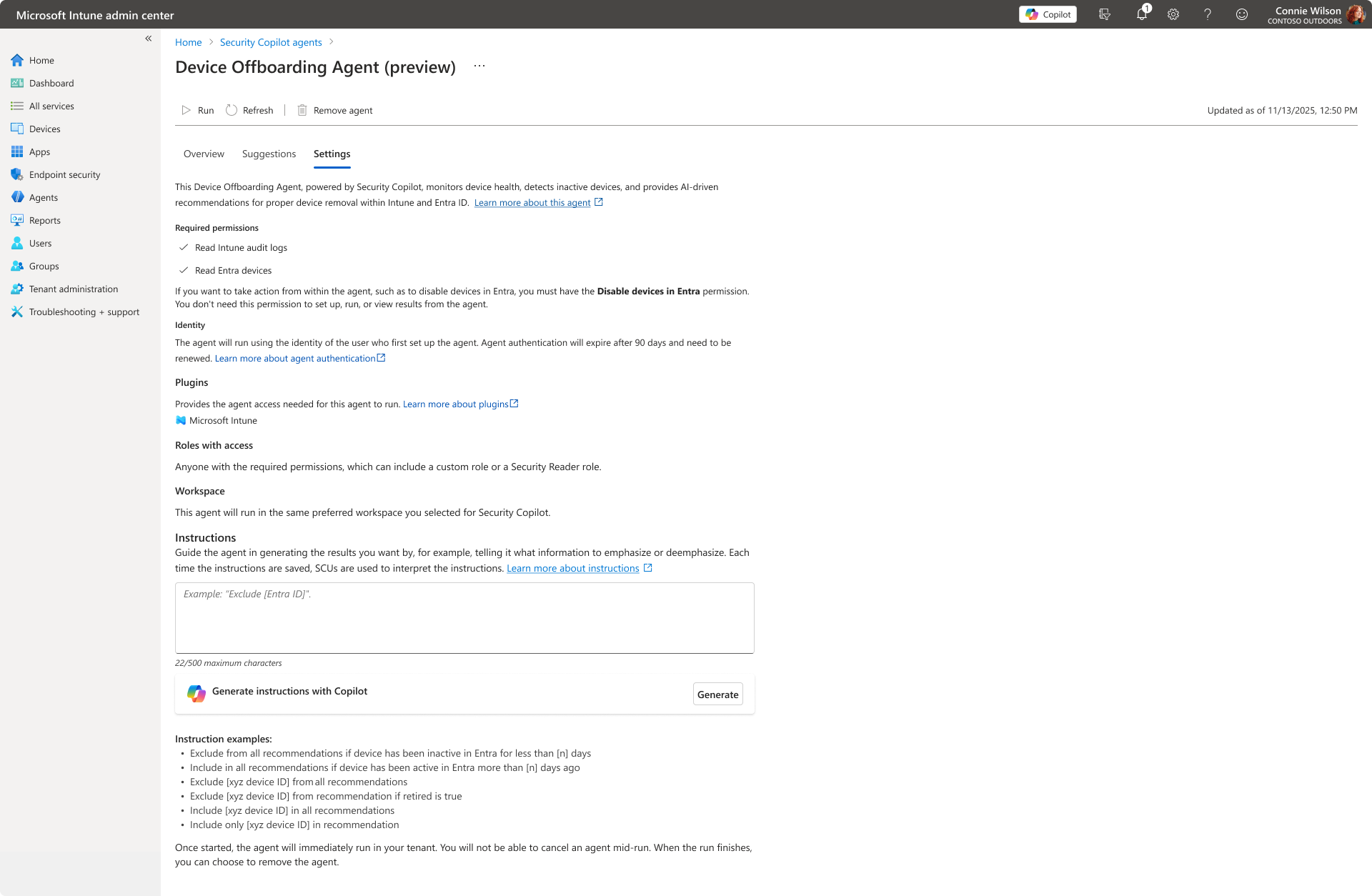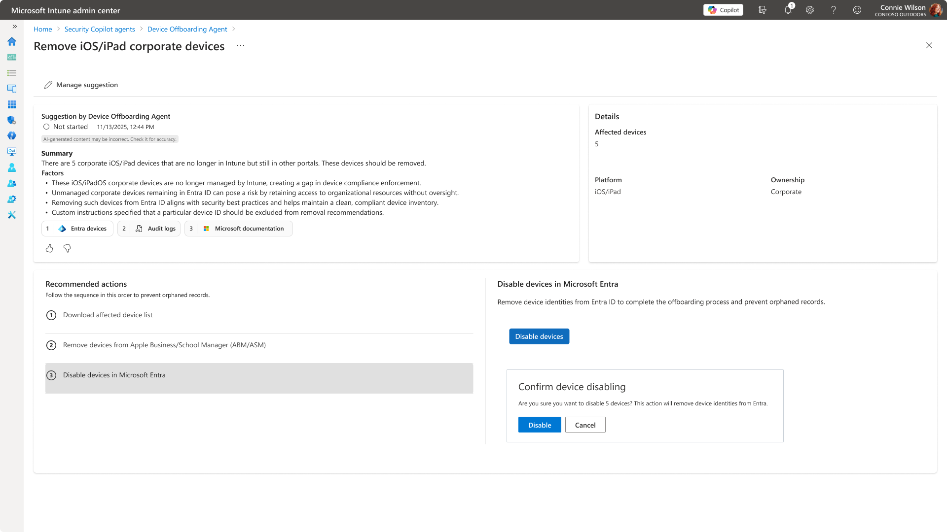 The Device Offboarding Agent identifies stale or misaligned devices across Intune and Entra ID, providing actionable insights and requiring admin approval before offboarding any devices. The Device Offboarding Agent complements existing Intune automation by surfacing insights and handling ambiguous cases where automated cleanup may not suffice.