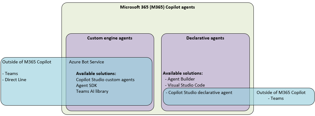| Engine hosting | Hosted in Microsoft 365. | Hosted in Microsoft 365 with Copilot Studio or externally with custom solutions such as Azure AI. |