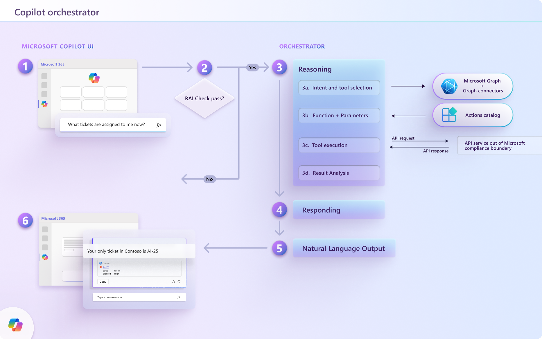 4. Responding: The orchestrator compiles all the information gathered during the reasoning process and submits it to the LLM to create a final response. After ensuring the response complies with Responsible AI guidelines, it sends the response back to the orchestrator, which logs it in the context store and delivers it to the user via the Copilot UI.