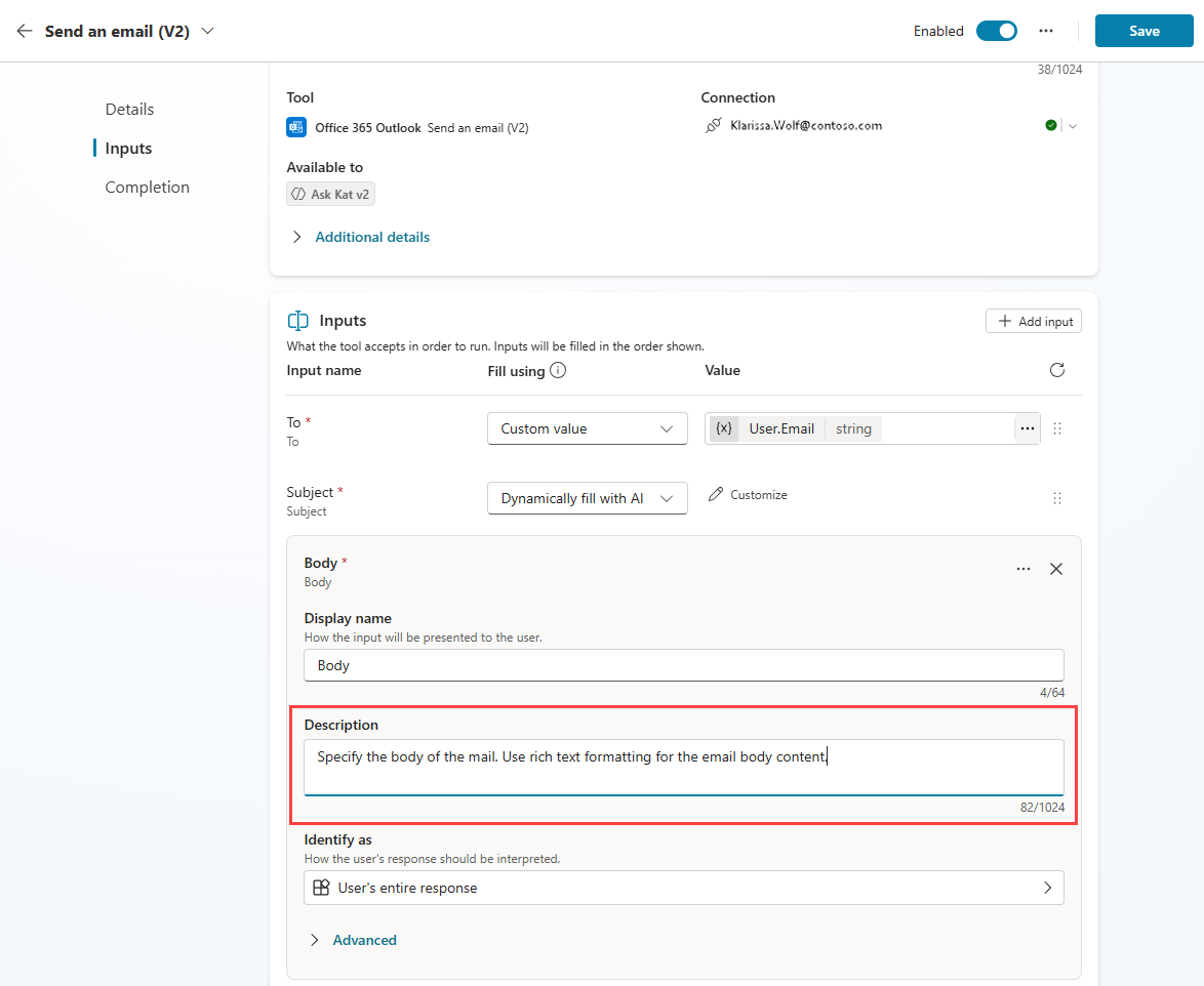 แนะนำให้เอเจนต์ของคุณ "ส่งอีเมลโดยใช้การจัดรูปแบบ Rich Text สำหรับเนื้อหาอีเมล" หรือถ้อยคำที่คล้ายกัน คุณยังสามารถเพิ่มคำขอนี้ในคำอธิบายเครื่องมือเพื่อการเน้นเพิ่มเติมได้