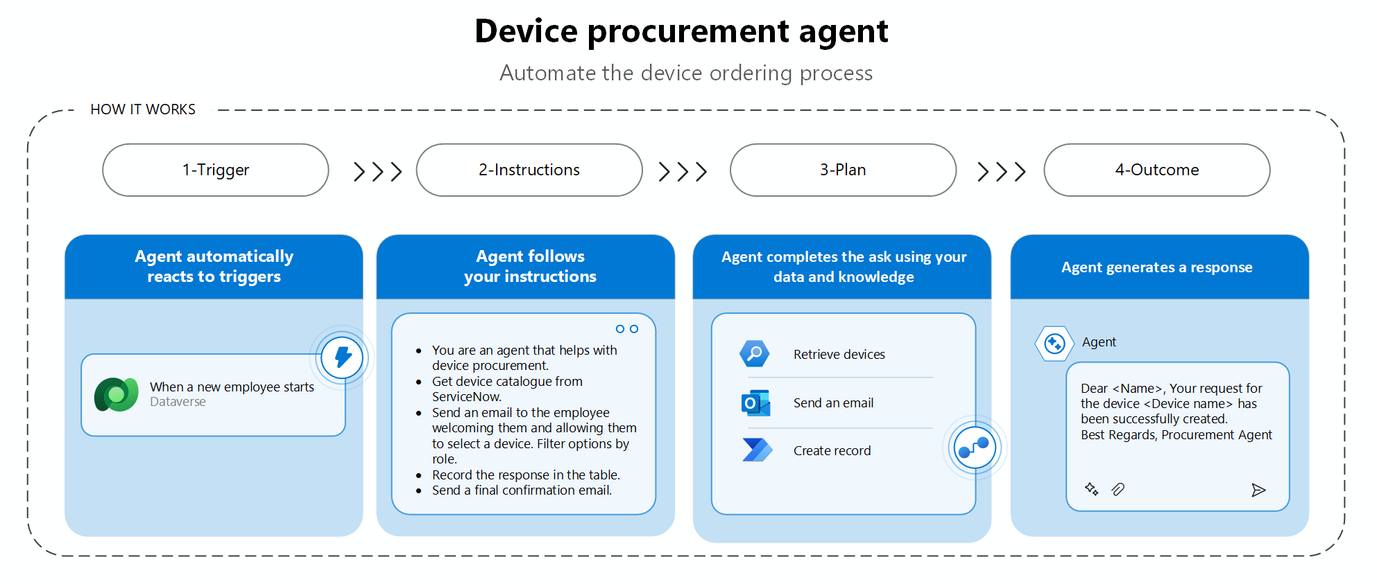 การบอกว่าเอเจนต์ต้องทำอย่างไรกับส่วนข้อมูลทริกเกอร์ในคำแนะนำทริกเกอร์จะเป็นประโยชน์ ตัวอย่างเช่น หากเอเจนต์ของคุณช่วยพนักงานใหม่เริ่มต้นใช้งานบริษัทของคุณ ให้กำหนดส่วนข้อมูลทริกเกอร์เป็น "เตรียมความพร้อมพนักงานต่อไปนี้" คำแนะนำนี้จะตามด้วยเนื้อหาของทริกเกอร์ของคุณ ซึ่งมีรายละเอียดของพนักงานใหม่ เมื่อเอเจนต์ของคุณได้รับส่วนข้อมูลแล้ว จะปฏิบัติตามคำสั่งของเอเจนต์ที่กำหนดไว้สำหรับการปฐมนิเทศพนักงาน