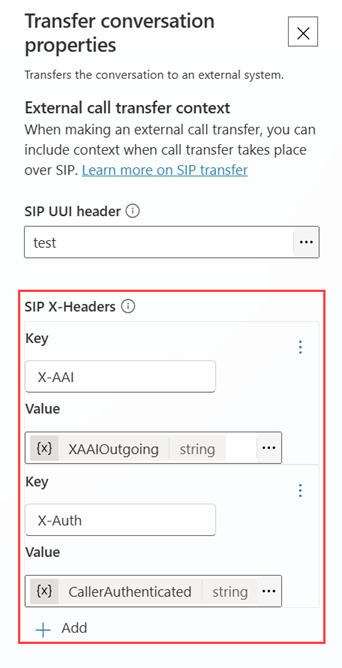 SIP X-headers ช่วยให้คุณสามารถส่งข้อมูลเมตาแบบกําหนดเองระหว่างระบบโทรศัพท์และตัวแทนที่เปิดใช้งานเสียงของคุณ ตัวแทนที่รองรับเสียงของ Dynamics 365 Contact Center สนับสนุนส่วนหัว X ทั้งขาเข้าและขาออก การกําหนดค่านี้ช่วยให้สามารถแลกเปลี่ยนข้อมูลได้อย่างราบรื่นระหว่างการโอนสายและการกําหนดเส้นทาง