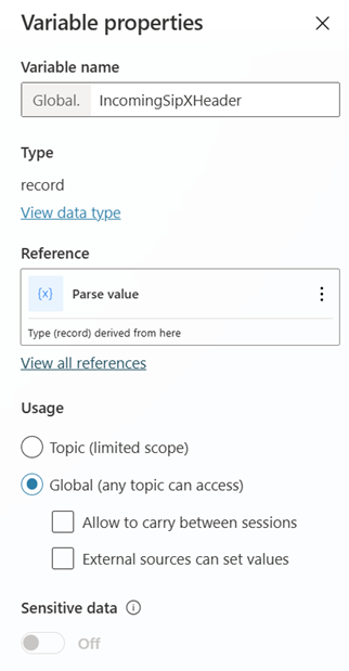 IncomingSipXHeader)ตั้งค่าขอบเขตของตัวแปรเป็น ส่วนกลาง เพื่ออนุญาตให้เข้าถึงหัวข้อต่างๆ ในตัวแทนของคุณ