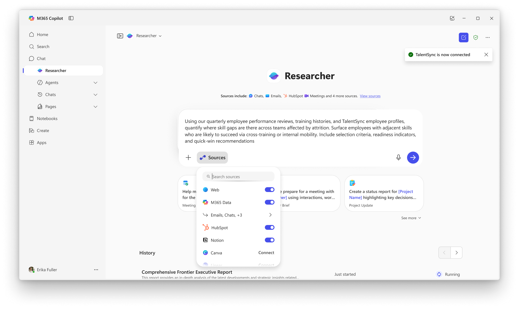 - Users can discover the data source in the Sources option in the Researcher agent.