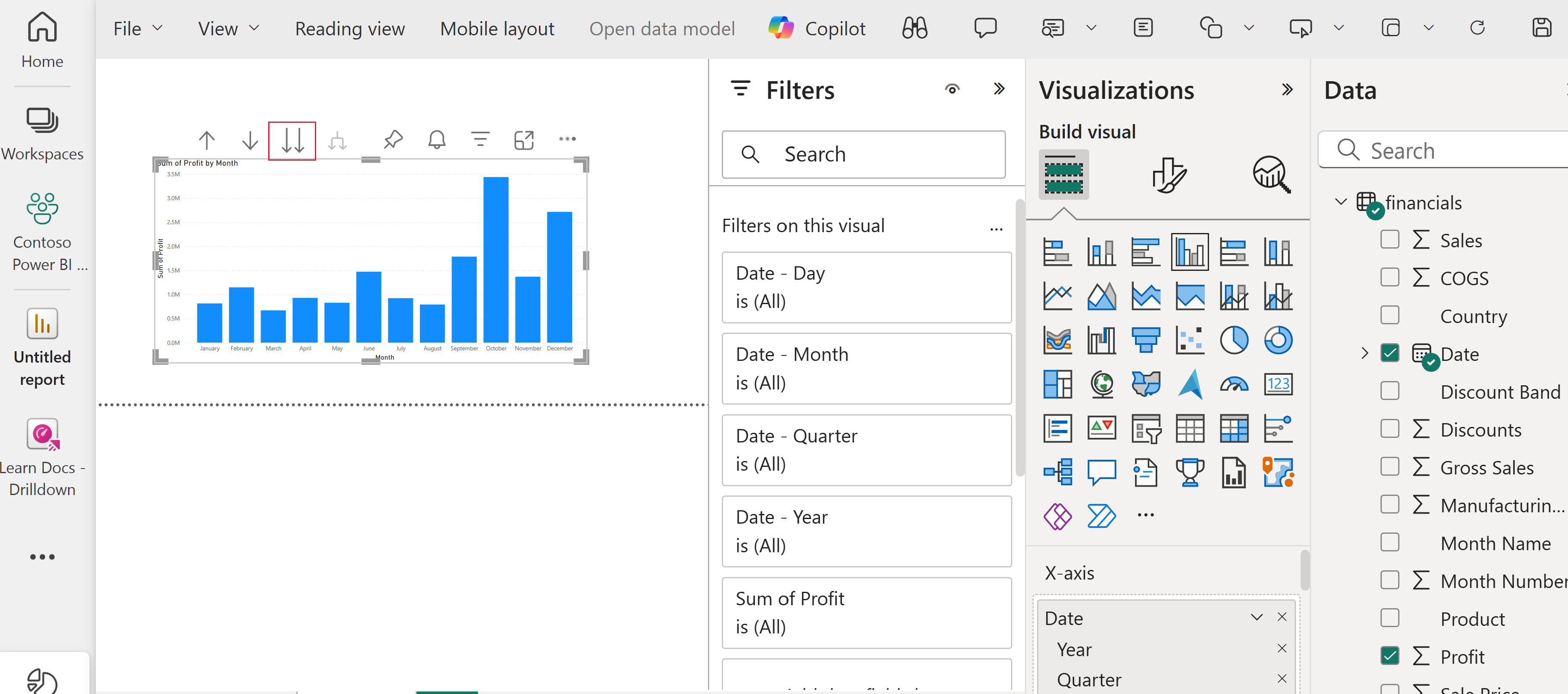 - เลือกแผนภูมิ จากนั้นเลือกลูกศรคู่ที่ถูกทําไว้เพื่อแสดงไตรมาส จากนั้นเลือกอีกครั้งเพื่อแสดงเดือน