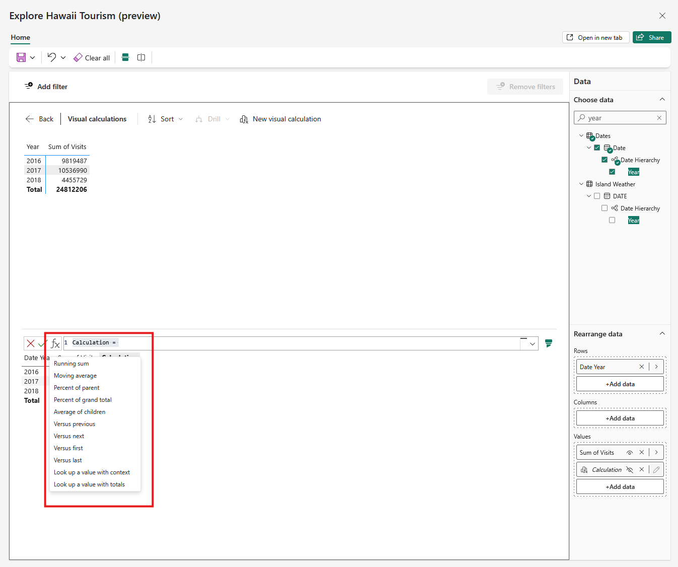 คุณสามารถเพิ่ม การคํานวณด้วยภาพ ลงในวิชวลของคุณได้ เลือกปุ่ม การคํานวณวิชวลใหม่ บนวิชวลใดๆ เพื่อเข้าสู่โหมดแก้ไขการคํานวณด้วยวิชวล
