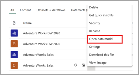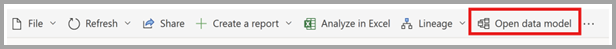 - จากรายการเนื้อหาฮับข้อมูล ให้เลือกตัวเลือกเพิ่มเติม (...) สําหรับแบบจําลองความหมายและเลือก เปิดแบบจําลองข้อมูล