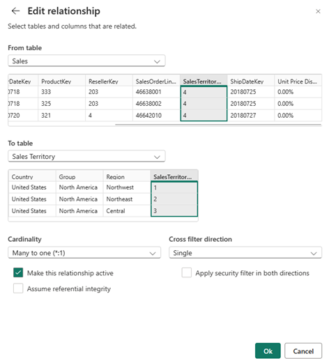 จากที่นี่ กําหนดค่าคุณสมบัติของความสัมพันธ์ และเลือกปุ่ม ตกลง เมื่อแก้ไขความสัมพันธ์ของคุณเสร็จสมบูรณ์เพื่อบันทึกข้อมูลความสัมพันธ์
