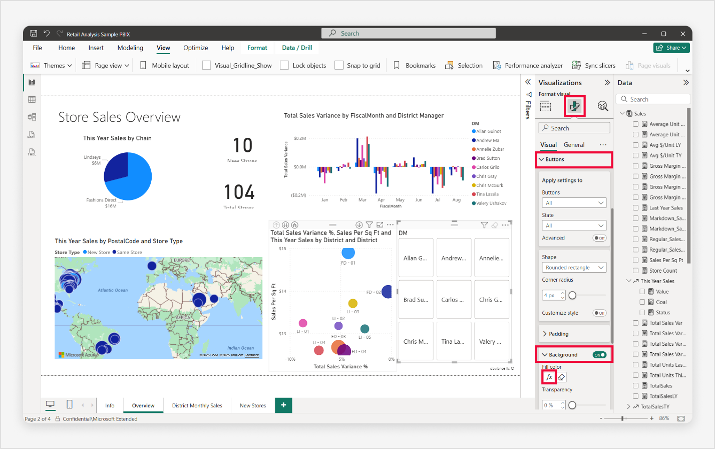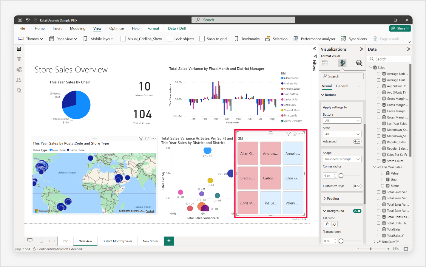 เมื่อเปิด PBIX ตัวอย่างการวิเคราะห์การค้าปลีก ตรวจสอบให้แน่ใจว่าคุณอยู่ในหน้า ภาพรวม โดยเลือกแท็บ ภาพรวม เมื่อต้องการเพิ่มพื้นที่สําหรับตัวแบ่งส่วนข้อมูลปุ่มของคุณ ให้เลือกและปรับขนาดแผนภูมิกระจายโดยการลาก จุดจับการแสดงภาพสีเข้ม จากนั้น โดยไม่ได้เลือกสิ่งใดบนพื้นที่รายงาน เลือกไอคอน ตัวแบ่งส่วนข้อมูล ปุ่ม ในแท็บ สร้างวิ ชวล ในบานหน้าต่าง การแสดงภาพ เพื่อสร้างตัวแบ่งส่วนข้อมูลใหม่บนพื้นที่รายงาน