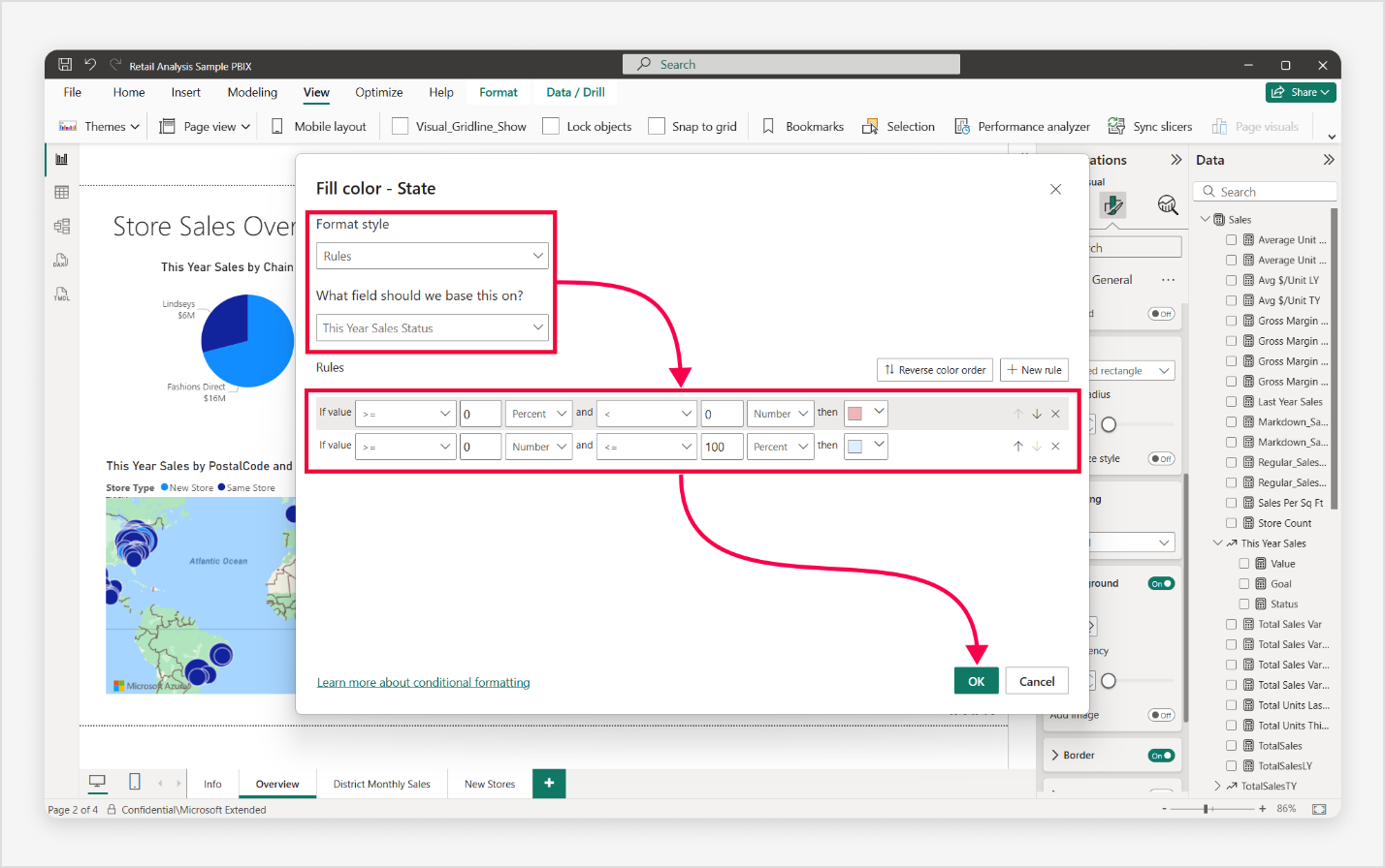 เมื่อกําหนดกฎแล้ว ให้เลือก ตกลง เพื่อใช้การจัดรูปแบบที่ต้องการตามเงื่อนไขของคุณ