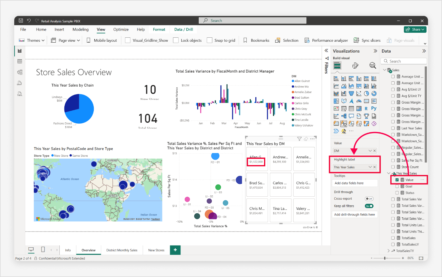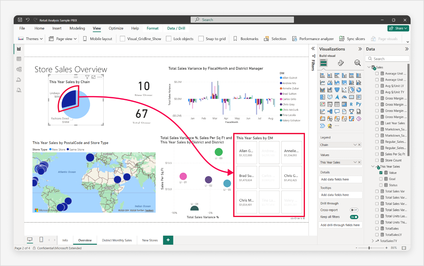 - ค้นหาและเลือกสําเนา PBIX ตัวอย่างการวิเคราะห์ร้านค้าปลีก ไฟล์จะเปิดขึ้นในมุมมองรายงาน