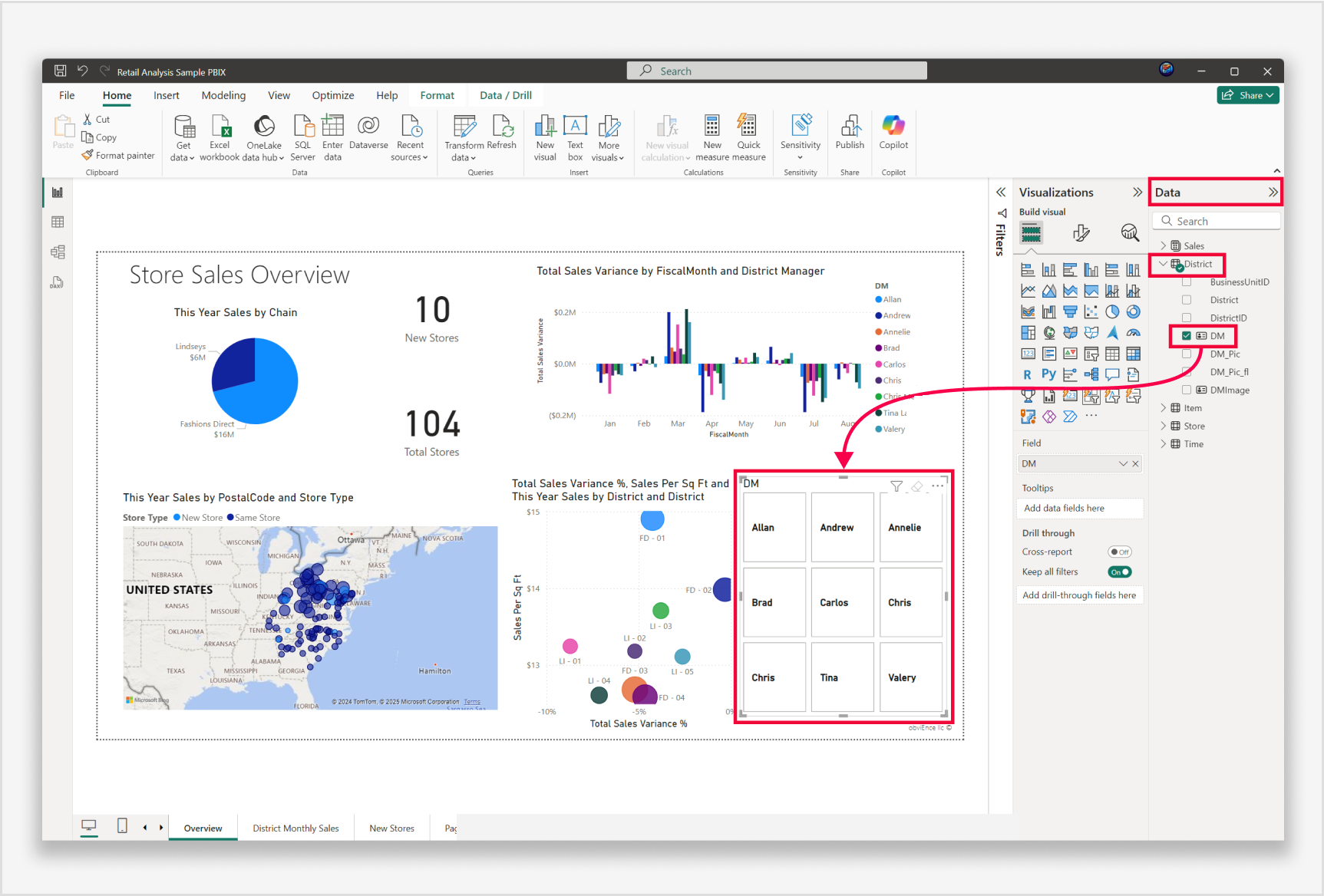 เมื่อต้องการเพิ่มข้อมูลลงในวิชวล ให้ใช้บานหน้าต่างข้อมูล เมื่อเลือกตัวแบ่งส่วนข้อมูลของคุณบนพื้นที่รายงาน ให้ไปที่แผงข้อมูล ขยายตาราง เขต และเลือก DM เพื่อเติมข้อมูลตัวแบ่งส่วนข้อมูล ตัวแบ่งส่วนข้อมูลจะแสดงไทล์ที่มีชื่อผู้จัดการเขต คุณสามารถปรับขนาดตัวแบ่งส่วนข้อมูลได้ตามต้องการและจัดเรียงองค์ประกอบบนพื้นที่ทํางานใหม่ตามความต้องการของคุณ ระวังอย่าให้ตัวแบ่งส่วนข้อมูลเล็กเกินไป ซึ่งส่งผลต่อข้อมูลที่แสดง