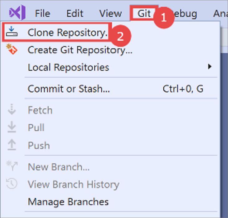 a. From the top-level Visual Studio menu, select Git > Manage Branches.