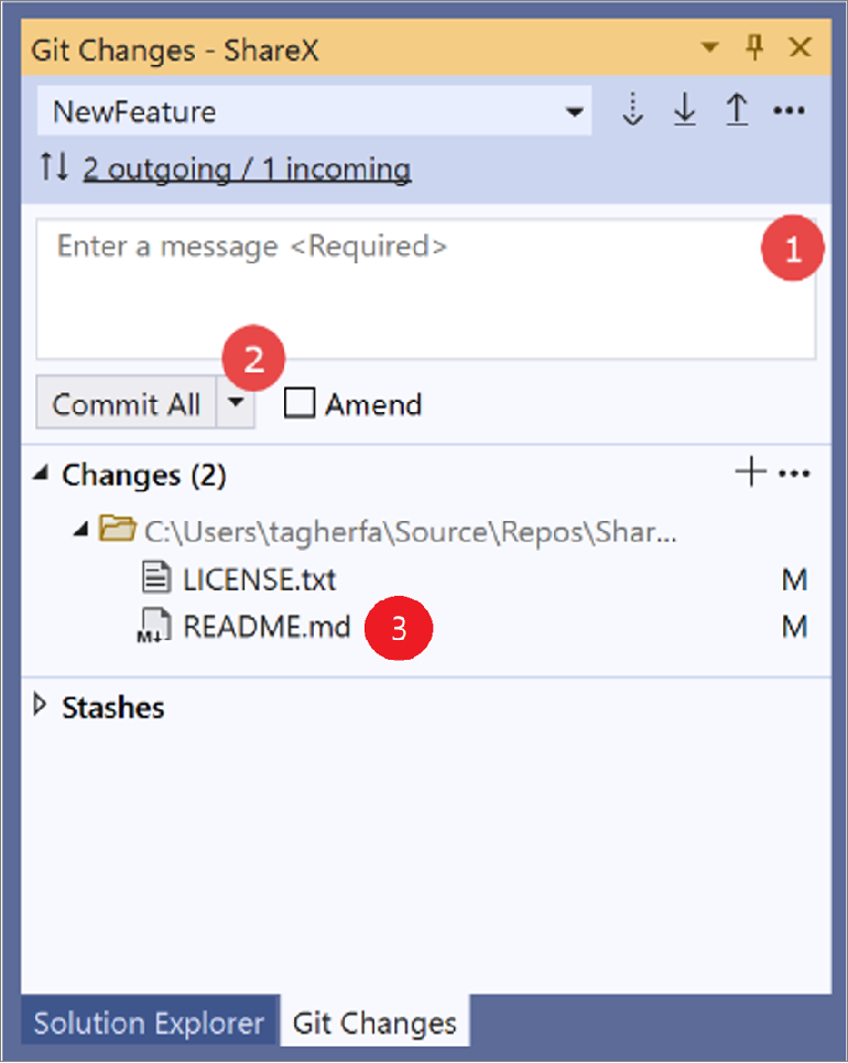 Amend a commit Screenshot of the Changes window for Team Explorer in Visual Studio 2019, with an 'amend a commit' procedure overlay.