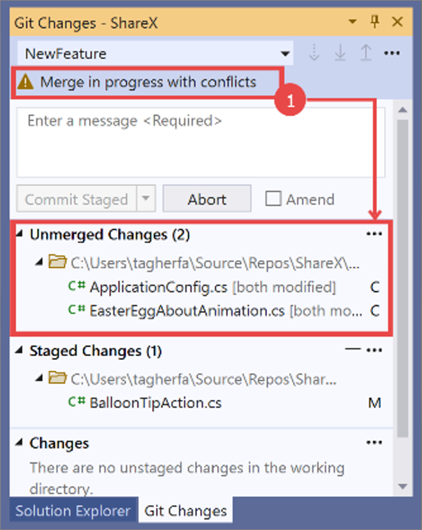 2. The list of files with merge conflicts appears in the Unmerged Changes section of the Git Changes window.